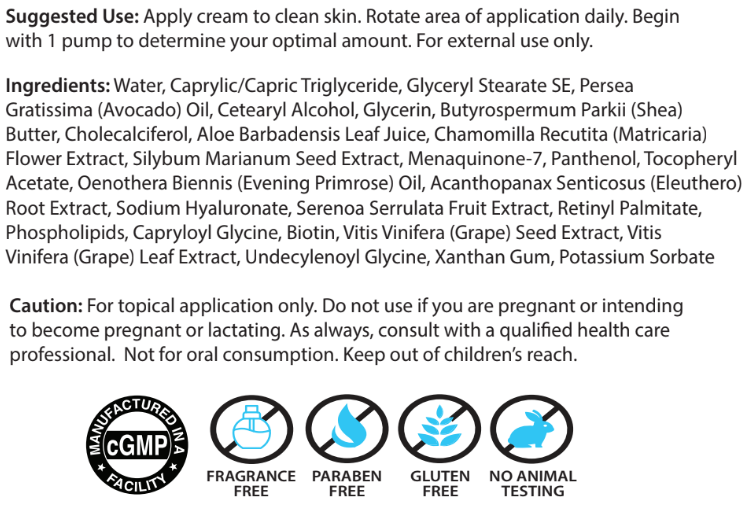 The information above is provided by the product manufacturer. It is recommended to consult with your physician before starting any new dietary supplement or skin cream. Discontinue use immediately if you experience any adverse effects and contact your physician for additional guidance.